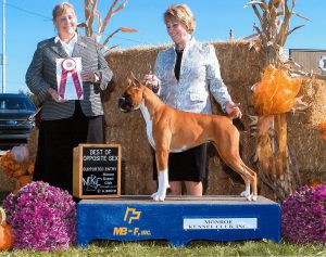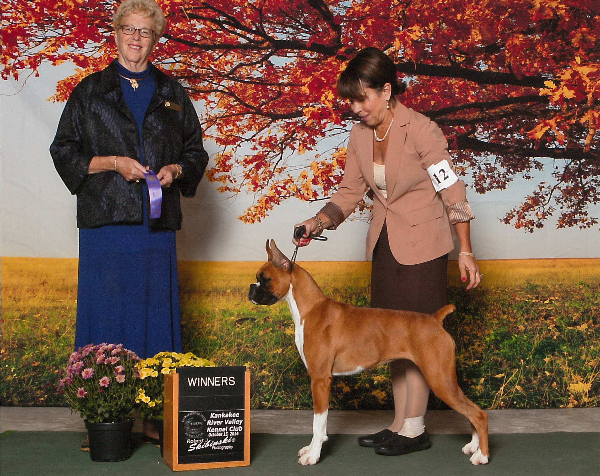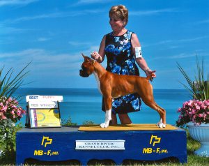 Ariana is our sweet princess. She has a beautiful head and conformation. Ari started her show career at 5 months of age winning Puppy Best of Breed and Group 1 at the Ann Arbor Kennel Club. She enjoys showing and went Winners Bitch and Best of Opposite Sex at the Ft. Steuben Kennel Club. She continued her show career under the able guidance of Sherry Canciamille going Winners Bitch and Best of Breed at Starved Rock Kennel Club then going Winners Bitch for a 5-point major at Cyclone County Kennel Club of Ames. She then went on for a 4-point major at the Louisville Kennel Club to obtain her Championship. Ariana started her journey towards her Grand Champion title with a 5-point major at the Monroe Kennel Club, and continuing until she obtained her Grand Champion, all owner handled.