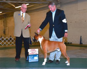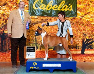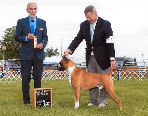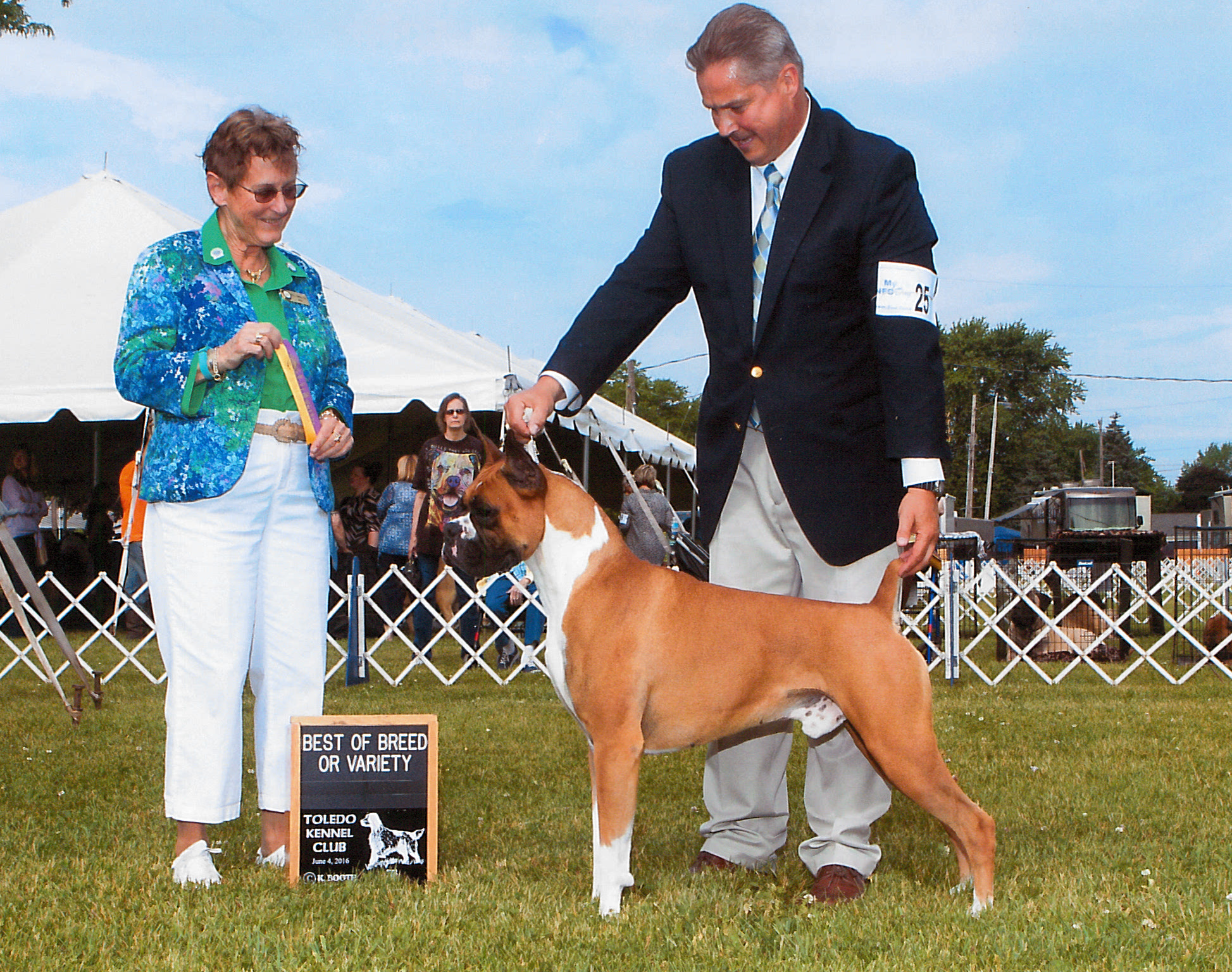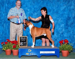 Shane is our “big boy” who still thinks he is a puppy. He has taken it upon himself to be the personal trainer for our puppies. He leads them on grand chases through the house – Shane carrying a toy and the pups following him in a conga line! Shane has a lot of bone with a beautiful body. He is pictured here going Winners Dog and Best of Winners for a 3-point major at the Kalamazoo Kennel Club show, and going Winners Dog and Best of Winners for a 3-point major at the Tri-City Kennel Club show, both under the able guidance of Sherry Canciamille. Shane achieved his Championship, then went on to obtain his Grand Championship at the McKinley Kennel Club.